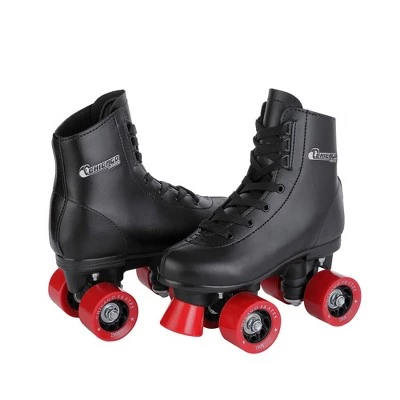 Boys’ Chicago Rink Roller Skates combine a comfy boot with adjustable fit and laces for a safe, snug fit. Lace ’em up and go-indoors or out. The toe-stop brakes are non-marking, so no worries there. Black laces match the skates, but kids can make them their own with different colors. Laced up, ready to roll. Ages 5 and up.