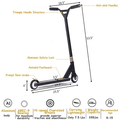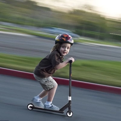 Reinforced with quality materials, the LWX-906 Freestyle Stunt Scooter is a safe, fun, and perfect kick scooter for becoming a stunt master. Not only is it stylish, but it is ultimately the best Custom Scooter for beginner riders to learn bunny hops, tail whips, and more! With oversized handle bars and deck allow for easy control at all times. The solid spring-steel rear brake makes stopping easy and durable construction handles the impacts of freestyle riding. Whether you are learning basic moves or developing your own special style to bring to the skate park, this spectacular ride is your best choice in achieving a safe, fun, and exhilarating riding experience