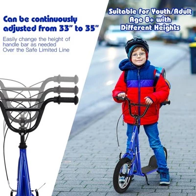 Terrific kick scooter not only facilitates daily commuting, but also fits entertainment playing. Made of reinforced carbon steel, the youth scooter ensures high durability and lasting service life. The enhanced metal structure allows to load up to 165lbs, suitable for kids of 8 to 12 years old. What’s more, the handlebar height can be adjusted between 33” to 35” (over the safe limited line), meeting needs of different heights. With 2 V-type handbrakes, it is easy to control the riding speed for safety enhancement. Plus, 12” air filled wheels offer smooth and steady riding on different kinds of terrain. Standing on the widened non-slip deck, the rider can enjoy comfortable riding in balance. All in all, our kick scooter is friendly for entertainment and trips.