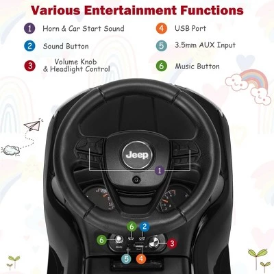 - Different Entertainment Functions: Steering wheel with horn and car-start sound (2 x 1.5V AA batteries required, not included) allows for the car turning and provides kids with a real driving experience. In addition, bright headlight, music button and USB port offer your little one endless joy.
