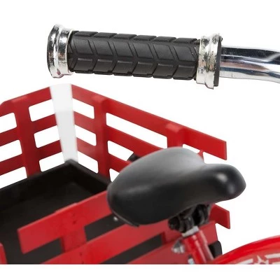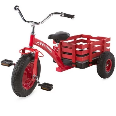 A perfect reason to get your kids outside playing in the sunshine, this quality slatted-wood wagon pulled by a shiny red trike is every child’s dream machine! Its uses are endless and so are the adventures. Kids pack the wagon with furry friends, toys, and supplies and “hit the road,” bound for a picnic, clubhouse, or a best friend’s house. Put the wagon to work-carry gardening materials to the garden, or transport tools to the garage. This durable metal tricycle is built for all sorts of indoor and outdoor adventures. Sturdy rubber tires stand up to backyard terrain (inflation required, pump not included). Wooden slats are removable (please ask an adult for assistance). Overall dimensions are 45″L x 22″W x 28″H, and the wagon measures 18″L x 14½”W x 15″H. Handlebars are 25″ from ground. Adult assembly required. Holds up to 110 lbs.