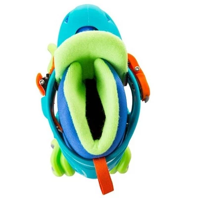 Roll smoothly and safely with the advanced proprietary-designed Shark Wheels Jr.™ Adjustable Roller Skates, the perfect first set of wheels for your aspiring roller-skating racers! Shark Wheels offer smoother, easier, and faster skating, with their sine-wave shape allowing skaters to roll over rough surfaces smoothly and move around small obstacles more efficiently. Skates pop with bright blue, neon green, and blaze orange trim, and thick padded tongues for comfort. Skaters are supported at the ankle with combination power straps and micro-adjustable buckles. Breathable mesh uppers keep serious skaters on the rink at the head of the pack, and with push-button ease, skates adjust to fit kids’ whole shoe sizes 1-4. Toe stops provide safe stopping for riders.Skates clean up easily with soap and water. Adult supervision required. Safety gear recommended.