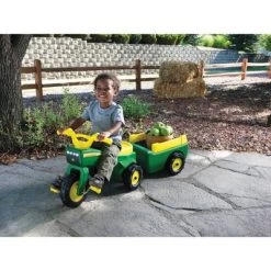 Driveways and sidewalks are ready to be explored on this John Deere Steel Tricycle. Featuring all new treads design graphics, kids will love having this as their first John Deere to ride around on. The heavy duty construction will stand up to the way kids really ride. This tricycle has a roomy front basket for all those treasures they find on the way or to give that favorite stuffed friend a ride.