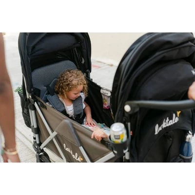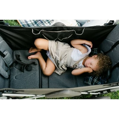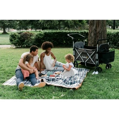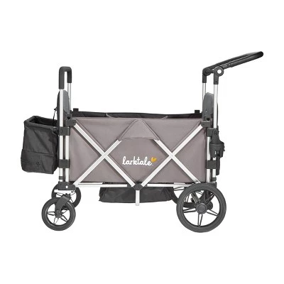 The adventure awaits! Designed for growing kids with places to go, the Larktale caravan™ has interior seating roomy enough for two passengers. The easy maneuverability puts even more activities in play such as sporting events, outdoor festivals, camping, and the beach. And when your little one is tuckered out, only the caravan™ offers unique patent pending reclining seats. You can also flip one seat forward into a flat base position to haul even more essentials on your outing or let your little ones stretch their legs. The convenient flip-down seat provides a supportive flat base inside the stroller/wagon, perfect for hauling cargo or provide a comfy flat seating position for your little one to stretch out. The Larktale Caravan has a large storage basket with a separate vented zippered compartment to hold all your outdoor essentials and it folds away when not in use. It also includes a flip-flop friendly brake, cup holder for your favorite beverages, and an adjustable handlebar with leatherette details to suit users of all heights.