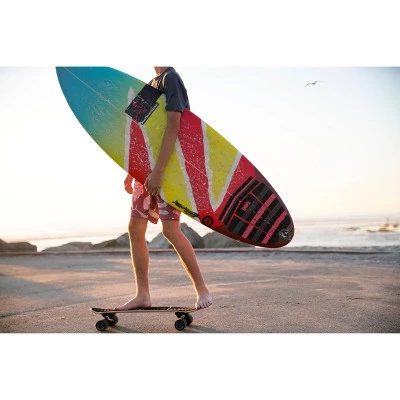The barefoot mini cruiser skateboard comes with an EVA surf stomp pad on top of the deck. This replaces the grip tape and makes the board super comfortable under your feet. The stomp pad provides just as much grip as traditional grip tape but comes with the added benefits of being cushy under your feet and easy on your fingers when you have to carry the board around. If you’re looking for an alternative or a companion activity to riding bikes, scooters, and other outdoor activities, the barefoot cruiser is a must. Have fun everywhere you go, it’s even great to bring camping or to the beach. This board includes a free skate tool.