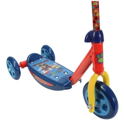 Have your kids zip around the neighborhood with this Paw Patrol 3-Wheel Scooterwith Lighted Wheels from Nickelodeon. This classic trike scooter for kids aged3 years and over is sure to be any kids favorite travel buddy.Accompanied with a colorful & fun Paw Patrol backpack, this scooter is idealfor beginners. Its light weight design with durable wheels makes it a breeze toscoot around small distances in a jiffy.Colored in bright blue with red accents and an ergonomically designed handle tohold onto. It is more than a cool new toy. Ride around on this one-of-a-kindkick scooter from Paw Patrol and have your kids show off their fandom ineffortless & fun style. Makes a great gift for any occasion.
