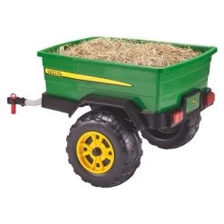 The Peg Perego John Deere Ground Force Tractor with Trailer takes outdoor play excitement to the next level! Good on grass, dirt, gravel, or pavement, kids will delight in listening to the FM radio while driving this battery operated John Deere Ground Force Tractor with full-size detachable trailer! Kids can load up the extra large trailer and deliver their payload just like a pro on the go. The adjustable seat also has flip-up armrests for added comfort . . . or just for looking cool behind the wheel. Speeds: 2 1/4 – 4 1/2 mph plus reverse, accelerator pedal with automatic brakes and large farm tractor wheels make driving this charming tracker trailer a total breeze. 12-volt rechargeable battery and charger included. Made in the USA at the John Deere factory in Fort Wayne, Indiana factory with domestic and global components. Ages 3 and up.