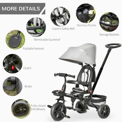 - 4-IN-1 MULTIFUNCTION: This tricycle stroller features a detachable parent push handle, backrest, and guardrail. Switch among four forms freely that suit your kid at different ages. It also comes with two storage baskets and a pocket to put supplies you need.