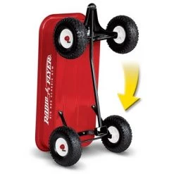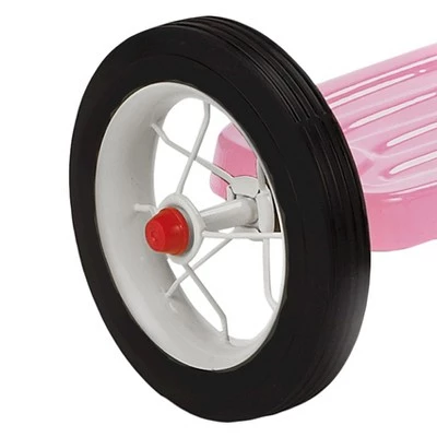 Ride in style on the Radio Flyer® Classic Pink 10” Tricycle! This adorable pink tricycle is classically styled and includes chrome handlebars, fender and ringing bell. This sturdy trike also features steel construction, durable spoked wheels, a 10” front wheel and real rubber tires. The controlled turning radius prevents tipping for safe and confident riding. It also has a rear step for easy on-and-off. The adjustable seat grows with your child.