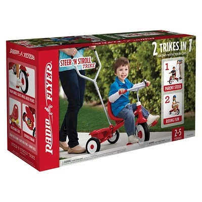 Take your child for a ride on the Radio Flyer® Steer & Stroll® Trike! This unique design offers two ways to ride. Our innovative pedal mechanism allows riders to rest their feet on the pedals like a footrest and enjoy the ride while adults push and steer. The push handle then removes for older children who are ready to ride on their own. The trike also features durable, quiet ride tires, an adjustable seat to grow with your child, and a solid steel frame. The fun covered storage bin and chrome bell add fun to the ride. For ages 2-5 years.
