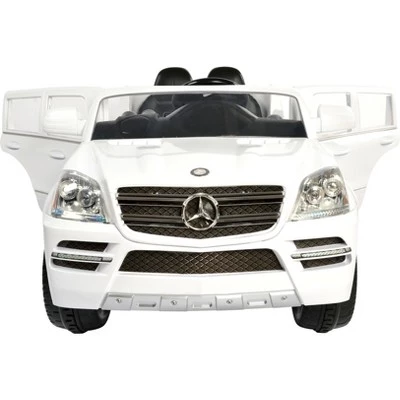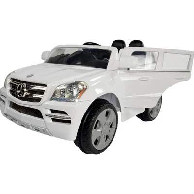 The 6V Mercedes battery-powered toy is a sleek, fun and exciting ride for any young driver! The luxury ride-on drives at 2.5 mph and comes loaded with features like working LED headlights, an MP3 Jack and a working radio. Press the sounds on the steering wheel for realistic car sounds, and use the two opening doors to climb in and out. Built for kids aged 3 and above, the 6V Mercedes has a premium design with a clear windshield, folding mirrors and realistic chrome rims. Rubber traction strips on the wheels let your child cruise on multiple surfaces.