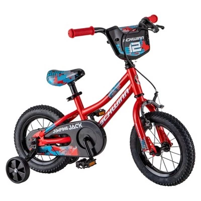 Teach your little racer to ride on a BMX bike designed just for kids with the Schwinn Jumping Jack. The Jumping Jack features a SmartStart BMX style steel frame that’s perfect for kids learning to ride. SmartStart frames are designed with narrower, kid-specific proportions for easier pedaling and handling. Plus, the Jumping Jack can grow with your child. The training wheels provide stability as they learn to ride, while the saddle and slack seat tube angle allow for easy adjustment as your child grows. It also includes both a rear coaster brake for intuitive stopping, and front and rear hand brakes to ease the transition to a bigger, hand-brake-only bike. And like all Schwinn bikes, the Jumping Jack comes with a limited lifetime warranty for as long as you own the bike. Teach your child to ride on a bike they’ll love with the Schwinn Jumping Jack.