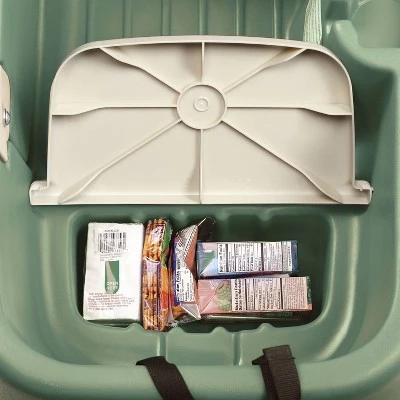 - Two molded-in cup holders on the side accommodate cans, juice boxes or cups.